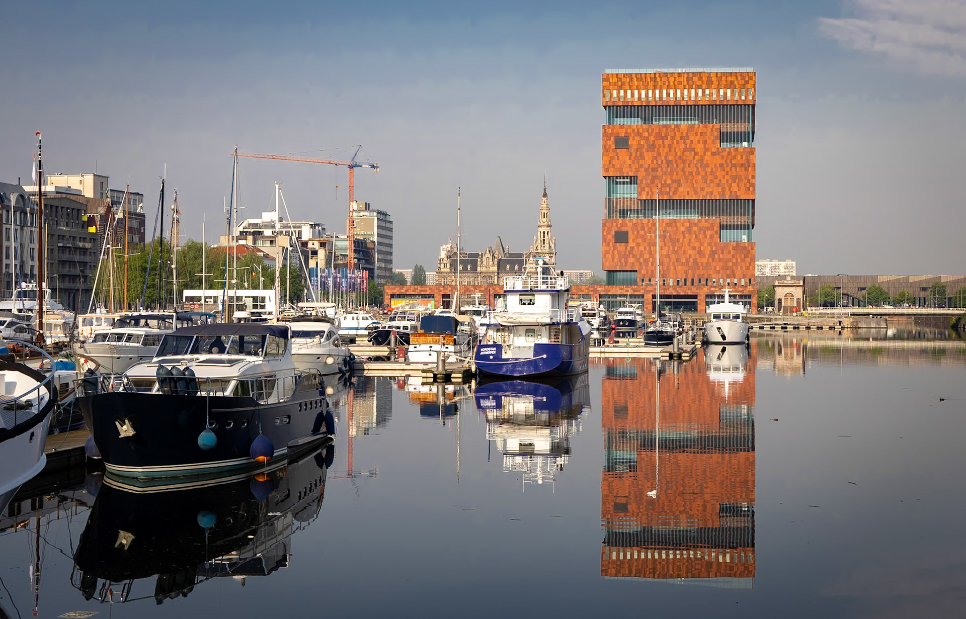 Rode bakstenen verheffen zich boven de horizon. Het MAS (Neutelings Riedijk Architecten) bewaakt de toegang tot de kleine haven waar boten tot rust zijn gekomen op een vlakke waterspiegel. Mijn oudste zoon ging er eens kijken ter inspiratie voor zijn Artez-afstuuropdracht. Nu mag ik het met eigen ogen aftasten; horizontaal verwond en messcherp uitgerekt. Panoramaglas vult de open wonden en biedt een open blik op de stad Antwerpen, voor mij en voor de door haar binnenste zoekende bezoekers.